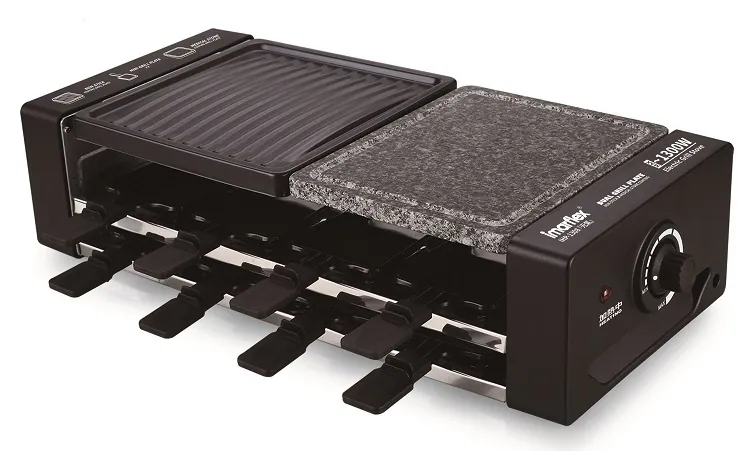 簡易溫控旋鈕,無級調溫; 設加熱指示燈 上層為不粘塗層燒烤盤 及 麥飯石塗層石頭燒烤板 下層設8個小型獨立燒烤盤,可供多人同時使用 防熱塑料外殼及手柄設計; 雙重不銹鋼加熱反射板 不銹鋼U型加熱元件; 最大火力: ~1300W 產品尺寸: W235xD235xH135mm