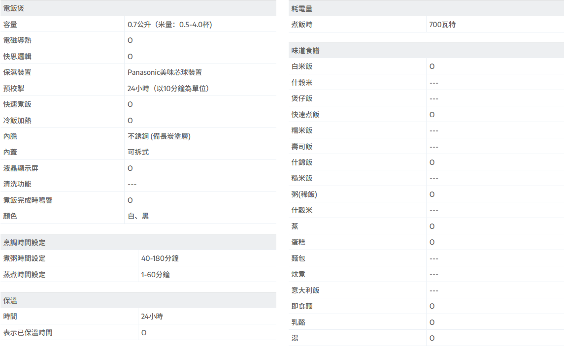 產品概覽容量:0.7公升(米量:0.5-4.0杯)2段IH磁應導熱,使內鍋本身發熱,令米飯平均受熱不銹鋼備長炭塗層內鍋採用快思邏輯技術烹調程式:白米(標準、精煮、快速煮飯)、冷飯加熱、湯/ 粥、什錦飯、蛋糕、即食麵、乳酪及蒸煮24小時烹調時間預約24小時保溫功能可拆式內蓋,方便清洗Panasonic美味芯球技術,自動調節鍋內溫度和加熱火力,封存米飯甘甜美味觸控式玻璃操作面板附件:蒸架、飯勺、飯勺架、粥勺及量杯700瓦特顏色:白、黑產地:中國5年保用