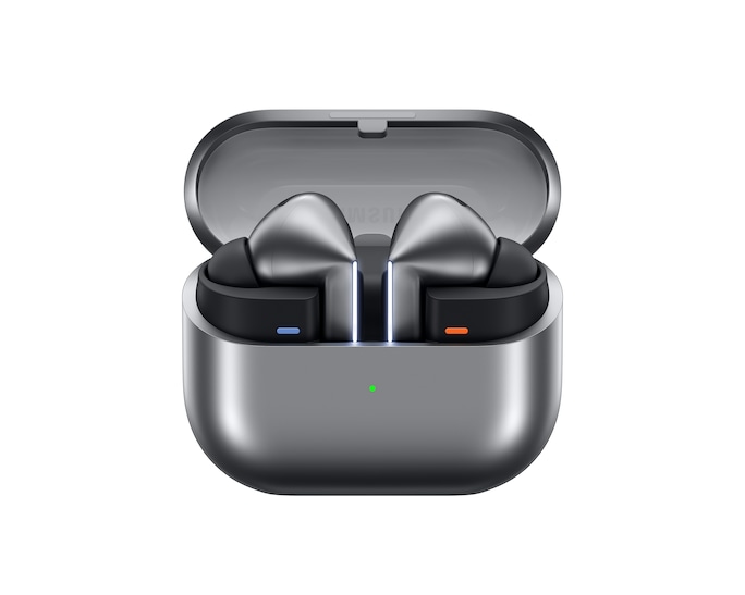 一對鉑金銀 Galaxy Buds3 Pro 智能降噪耳機出現在一個可打開的封閉盒中。打開後,耳塞會向上滑動,刀刃燈亮起,並懸停在打開的盒子上。